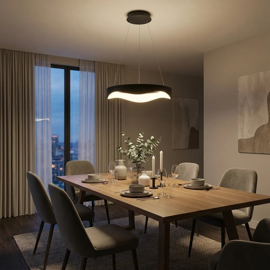 Ellisse è ideale per soggiorni moderni, sale da pranzo e ambienti dal gusto minimal, dove la luce diventa elemento decorativo.