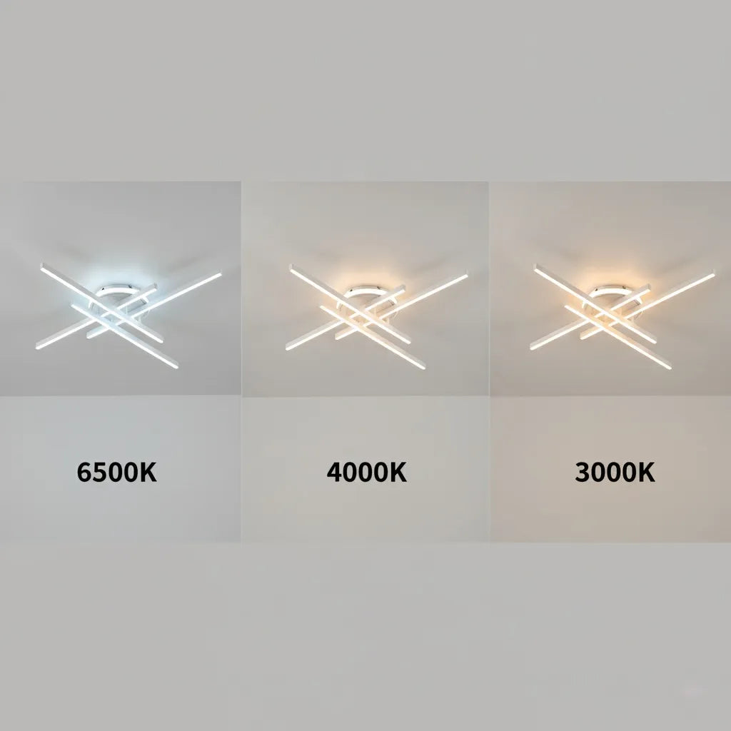 Intersect è una plafoniera dal design moderno e dinamico, caratterizzata da quattro barre luminose che si incrociano creando un effetto architettonico elegante e contemporaneo.