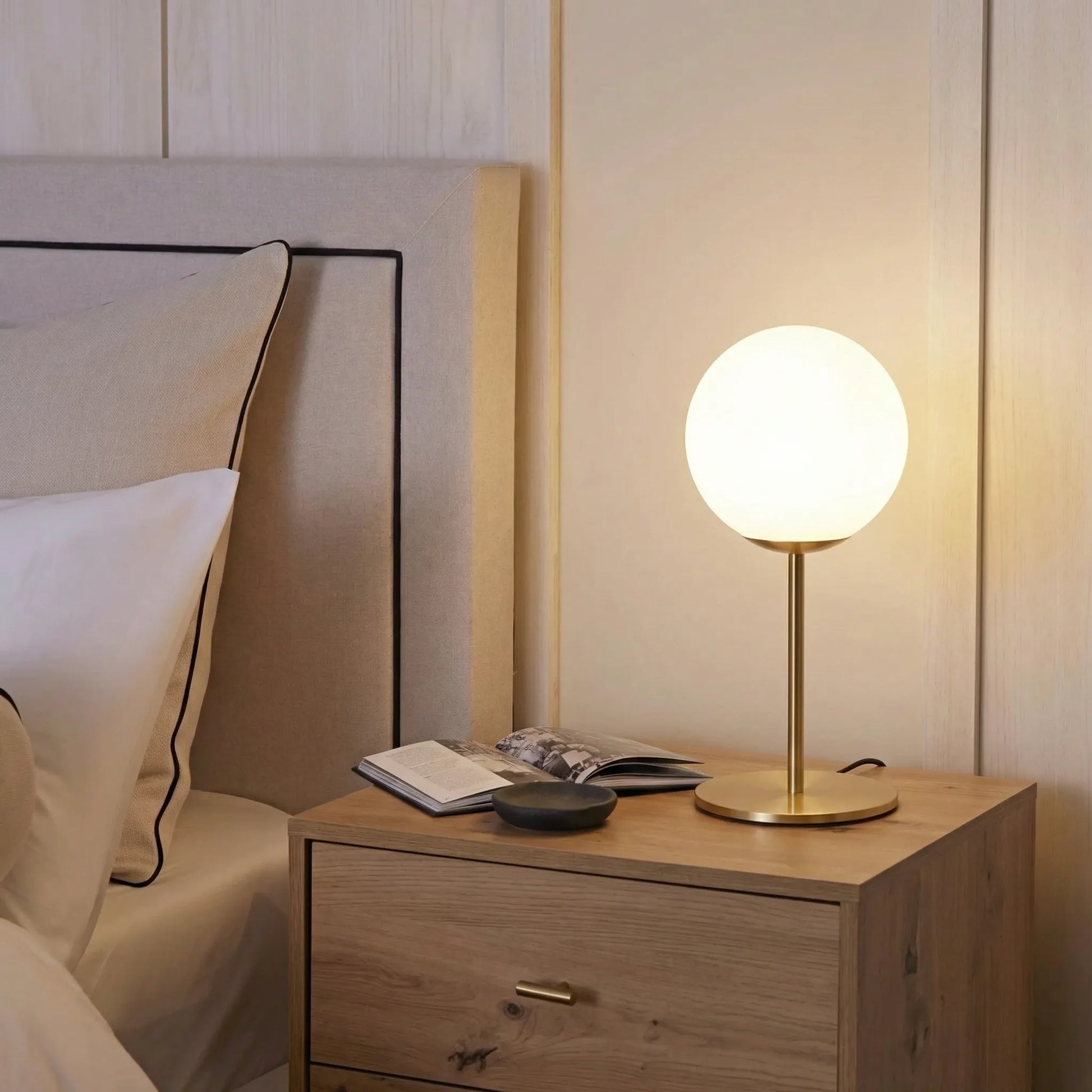 La luce filtrata dal globo in vetro opaco crea un’illuminazione rilassante, perfetta sia per la zona notte sia per living contemporanei.