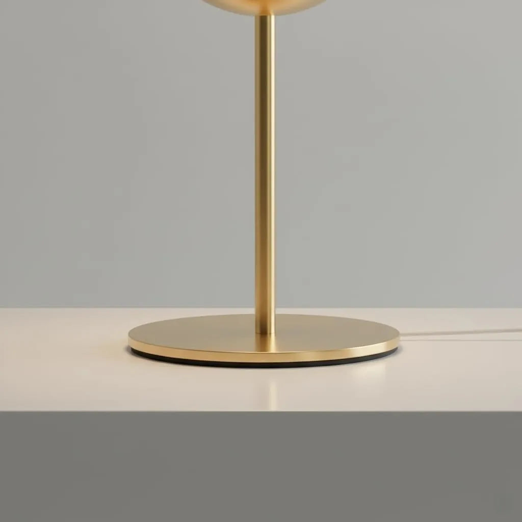 La base in metallo con finitura oro opaco satinato aggiunge eleganza e calore, rendendola ideale come punto luce decorativo su comodini, consolle e scrivanie.