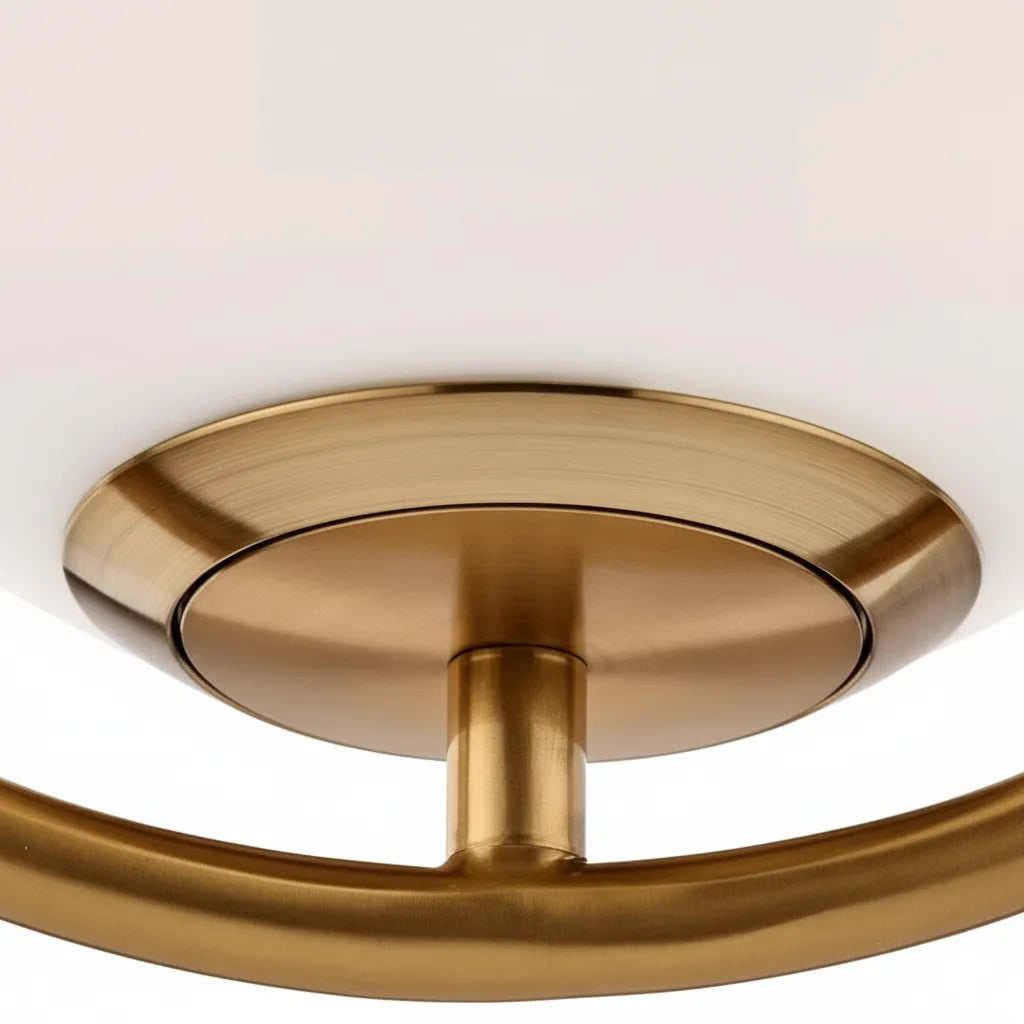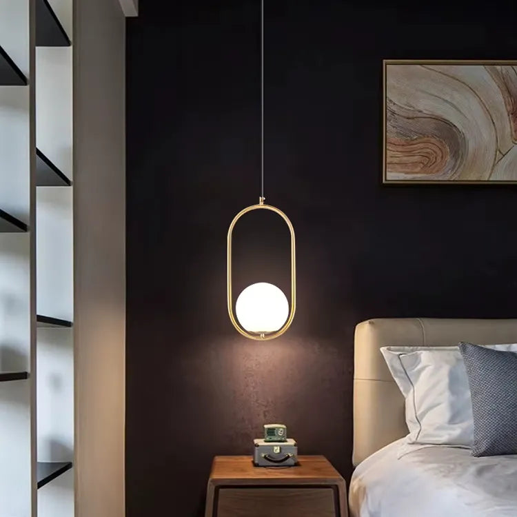 Ovalis è un lampadario a sospensione dal design elegante e minimale, caratterizzato da una cornice ovale in metallo dorato che racchiude una sfera luminosa in vetro satinato.